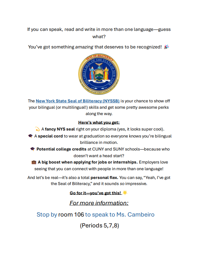 For more information: Stop by Room 106 to speak to Ms. Cambeiro (available during Periods 5, 7, and 8).